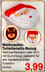 Jawoll, endlich auch Weihnachliches im Scheißhaus. Dank Jawoll kann mensch nun seinen Klo-Deckel mit einem Weihnachtsmann-Gesicht versehen. Aber nicht zu früh die Hose runterziehen! Sonst röhrt der Elch, den es alternativ zu kaufen gibt.